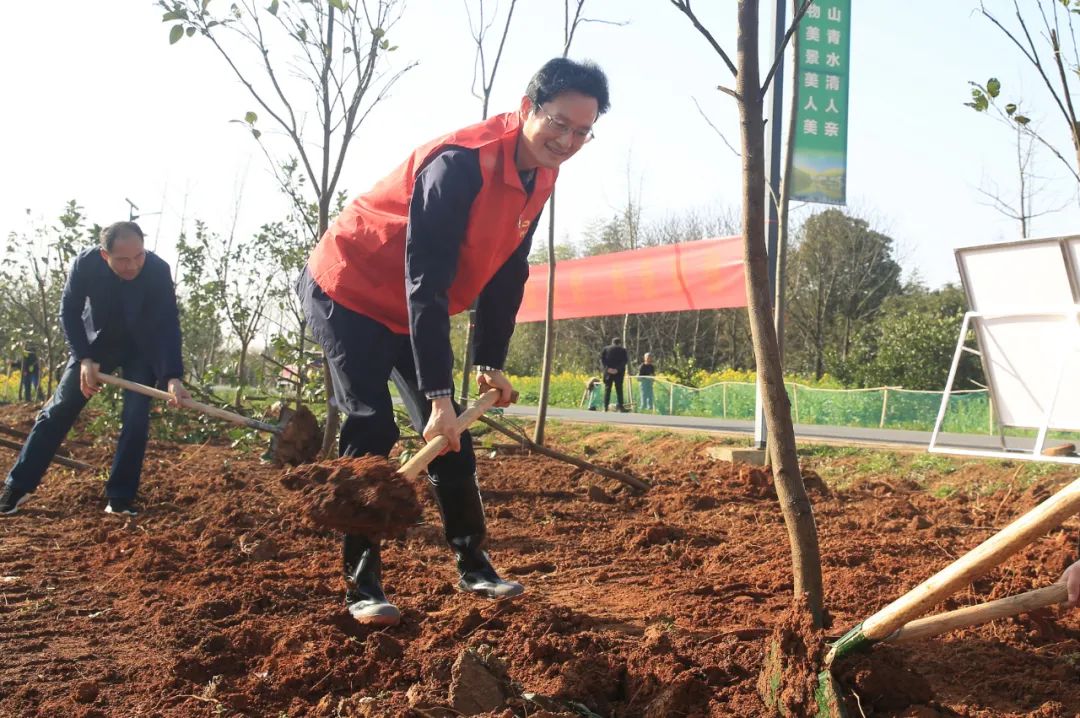 沐浴在阳光明媚的春光里,大家热情高涨、干劲十足。有的三人一组,挖坑、扶苗、培土,有的专程运送树苗,有的给栽好的树浇水,人人都一丝不苟、忙得不亦乐乎。“老贵,明年这个时候咱俩一起来看看,比比谁种的树苗长得好。”区综合行政执法局局长刘湘礼一边培土一边和身旁的住房和城乡建设局局长贵勇打趣。“哈哈,比比就比比,小心自己下不来台哦。”贵勇一边使劲踩实刚培好的土,一边笑呵呵地应和。
