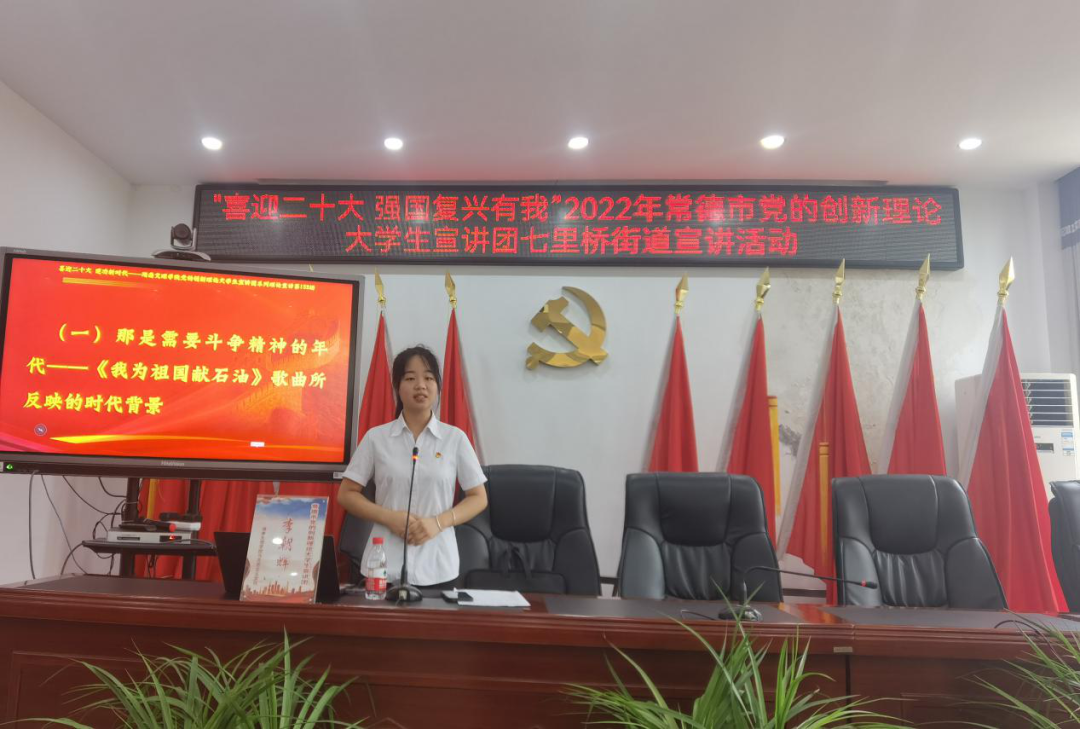 2022年7月26日上午在七里桥街道办事处进行“喜迎二十大 强国复兴有我”常德市党的创新理论大学生宣讲。活动由街道党工委委员、组织委员吴念主持,街道全体机关干部、社区干部参加。