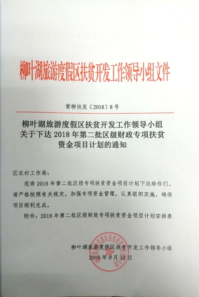 柳叶湖旅游度假区扶贫开发工作领导小组关于2018年第二批区级财政专项扶贫资金项目的公示 2018-09-10 15:45 来源:柳叶湖度假区 点击次数:次 分享到: 【打印】 【字体:小 大】 现将2018年第二批区级专项扶贫资金安排情况进行公示,接受社会监督。公示期间对资金安排如有异议,可向我办反映。附件:2018年第二批区级财政专项扶贫资金项目计划安排表.doc监督电话:0736-7129476;12317通讯地址:柳叶湖旅游度假区扶贫办公示时间:长期柳叶湖旅游度假区扶贫开发工作领导小组2018年9月10日 扫一扫在手机打开当前页