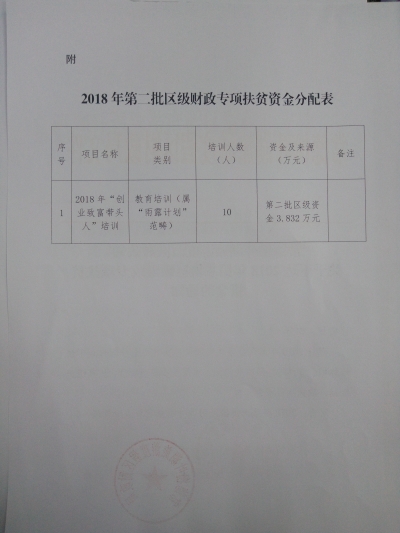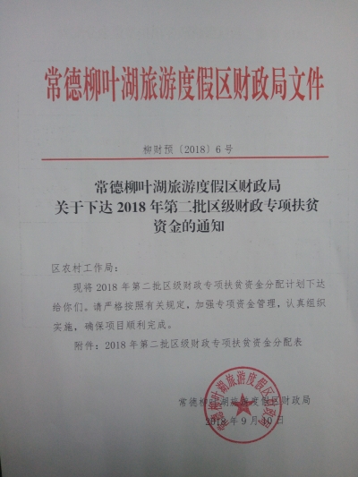 关于2018年第二批区级财政专项扶贫资金分配计划的公示 2018-09-10 15:38 来源:柳叶湖度假区 点击次数:次 分享到: 【打印】 【字体:小 大】 我区2018年第二批区级财政专项扶贫资金分配计划如下(柳财预〔2018〕6号):监督电话:0736-7129318;12317通信地址:柳叶湖旅游度假区管委会公开时间:长期附件:第二批区级财政专项扶贫资金计划分配(表格).docx常德柳叶湖旅游度假区财政局2018年9月10日 扫一扫在手机打开当前页