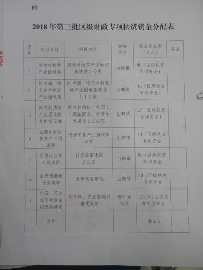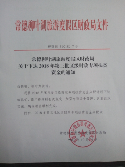 关于2018年第三批区级财政专项扶贫资金分配计划的公示 2018-10-11 15:43 来源:柳叶湖度假区 点击次数:次 分享到: 【打印】 【字体:小 大】 我区2018年第三批区级财政专项扶贫资金分配计划如下(柳财预〔2018〕7号):监督电话:0736-7129318;12317通信地址:柳叶湖旅游度假区管委会公开时间:长期附件:第三批区级财政专项扶贫资金分配计划(表格).docx常德柳叶湖旅游度假区财政局2018年10月11日 扫一扫在手机打开当前页