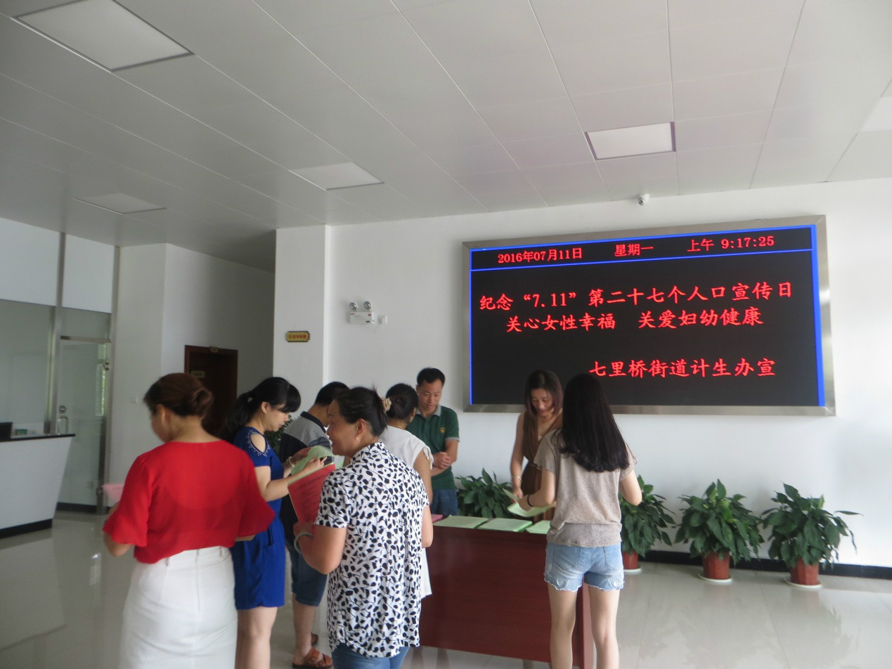 2016年7月11日是第27个世界人口日,国家卫生计生委、全国妇联将中国宣传活动主题确定为:“关心女性幸福,关爱妇女健康”,旨在倡导男女平等,关爱女性幸福,弘扬婚育新风,推广面向妇女儿童的公共服务。七里桥街道计生办积极响应,于7月11日在街道辖区内开展了“关心女性幸福,关爱妇幼健康”为主题的“7.11”第27个世界人口宣传活动。