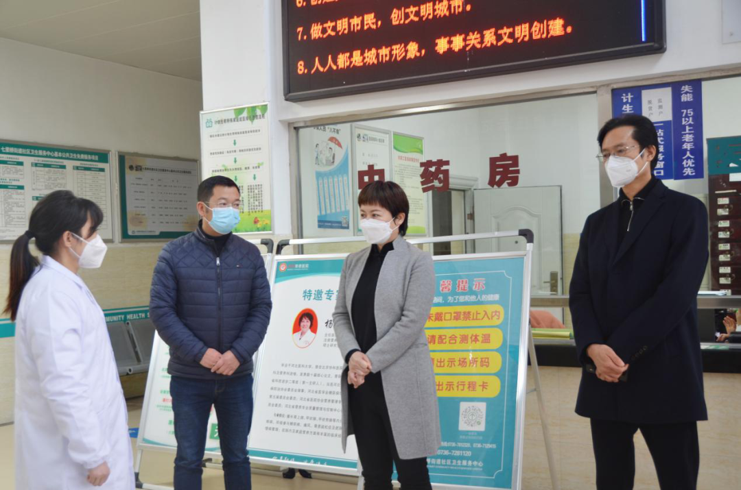 在柳叶湖社区卫生室网格医生服务点、七里桥街道社区卫生服务中心,伍彩霞向一线基层医务人员表示了亲切的慰问和诚挚的感谢,并与相关负责人深入交流,详细了解群众就医、医药物资筹备、医护资源配备等情况。她指出,随着春节临近,人们返乡过年,走亲访友,人员流动增加,人群聚集频繁,更容易引起新冠病毒感染,面对新形势、新要求、新任务,全区上下要把疫情防控工作做的更实、更细、更有温度。要进一步加强对脆弱人群的关爱,摸清身患基础性疾病的老年人、孕产妇、孤寡老人和留守未成年人等人员健康情况并建立相关台账,强化重点人群服务;要进一步加强医疗物资保障,做好常规药品、抗原检测试剂供应储备,确保满足治疗和群众基本用药需求;要一进步发挥医共体作用,形成联动机制,打通医疗服务的最后一个环节;要进一步加强宣传引导,引导群众科学认知病毒、加强自我防护,在思想、行为上形成自觉,当好自身健康第一责任人。伍彩霞特意叮嘱一线医务人员要做好自身防护,注意劳逸结合。